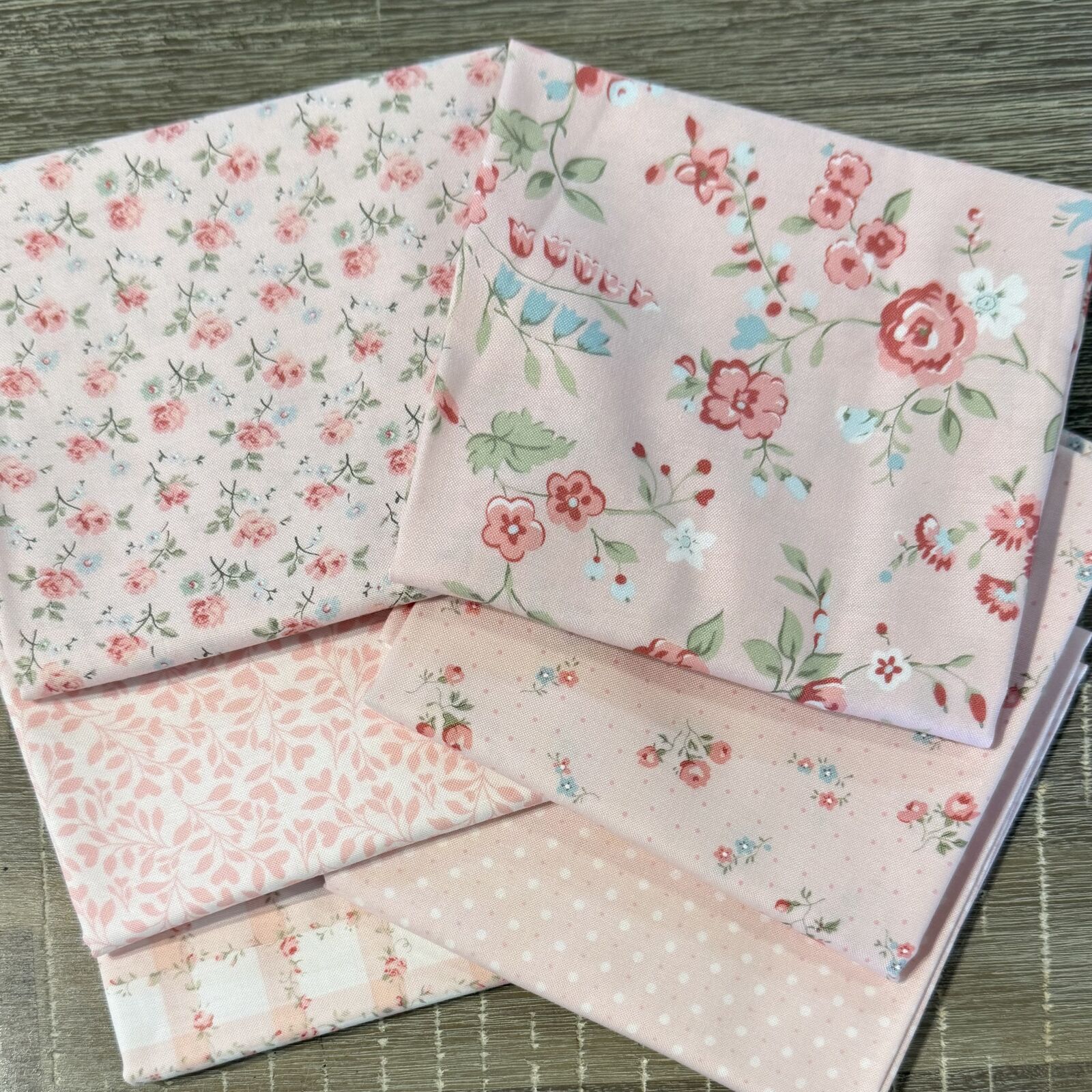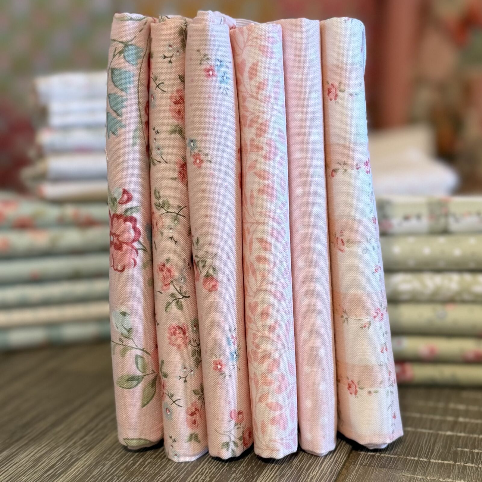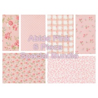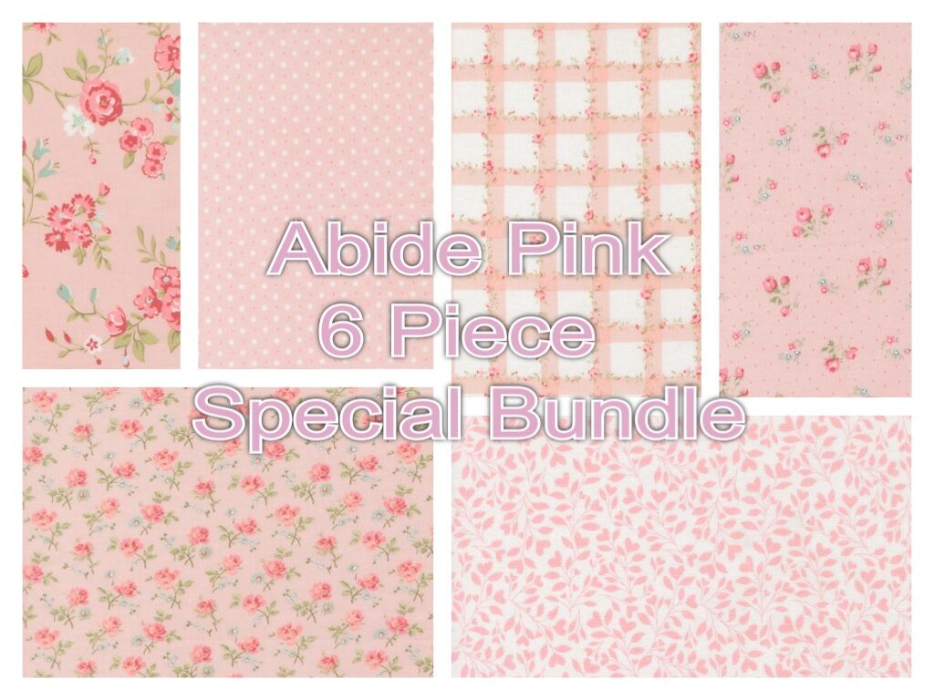 Soft, gentle and beautifully coordinated, this 6-piece Pink Bundle from the Abide collection by Brenda Riddle Designs for Moda Fabrics features delicate florals, classic dots and timeless blenders in calming shades of pink and soft neutrals.