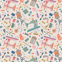 This print features detailed illustrations inspired by the sewing room, including vintage machines, thread, florals and birds, all brought together in a cheerful, nostalgic colour palette.