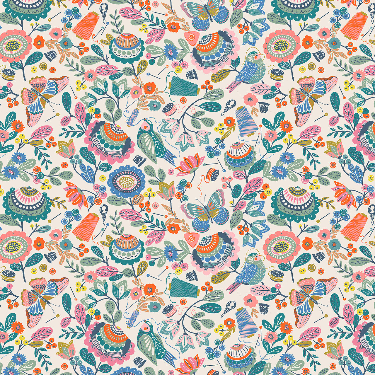 This print features detailed illustrations inspired by the sewing room, including vintage machines, thread, florals and birds, all brought together in a cheerful, nostalgic colour palette.