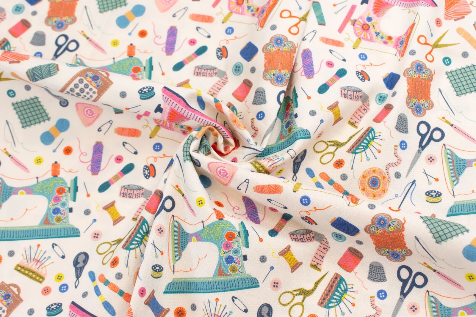 Country Sewing Club by Lena Morris for Thread & Ink UK is a bright and playful sewing-themed fabric collection, inspired by the joy of making. Featuring vintage sewing machines, spools of thread, florals and birds, this range brings together nostalgic charm with colourful, detailed prints.
