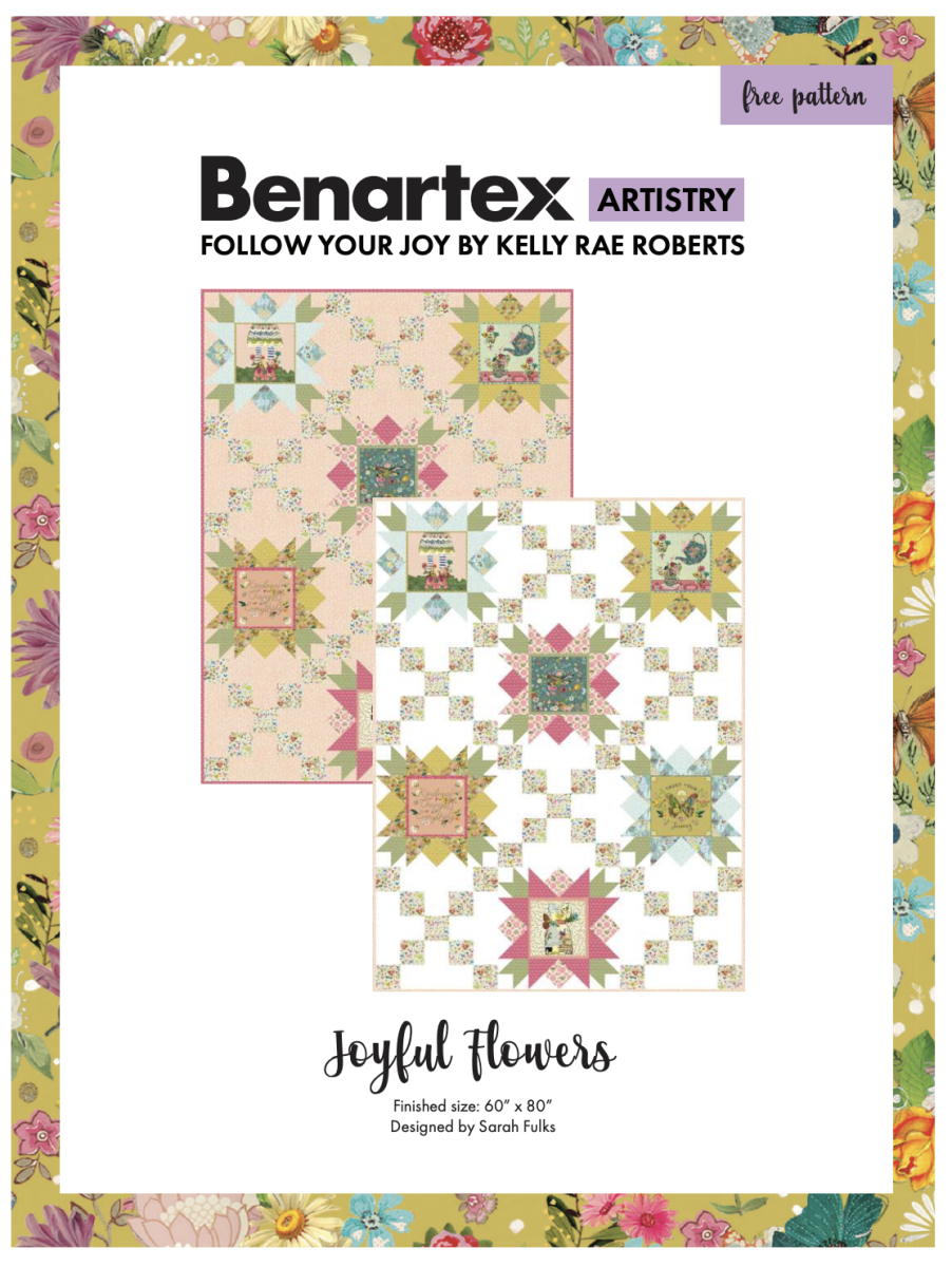 If you’ve fallen in love with Follow Your Joy by Kelly Rae Roberts for Benartex, you’ll be thrilled to know there’s a coordinating free quilt pattern available.